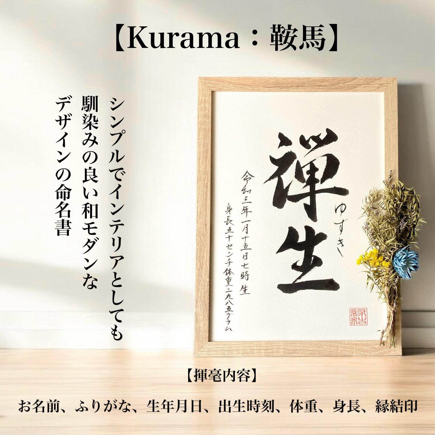 命名書 【Kurama:鞍馬】手書き 書道家 (A4サイズ 額縁付き) / 出産祝い お七夜 お宮参り 100日祝い