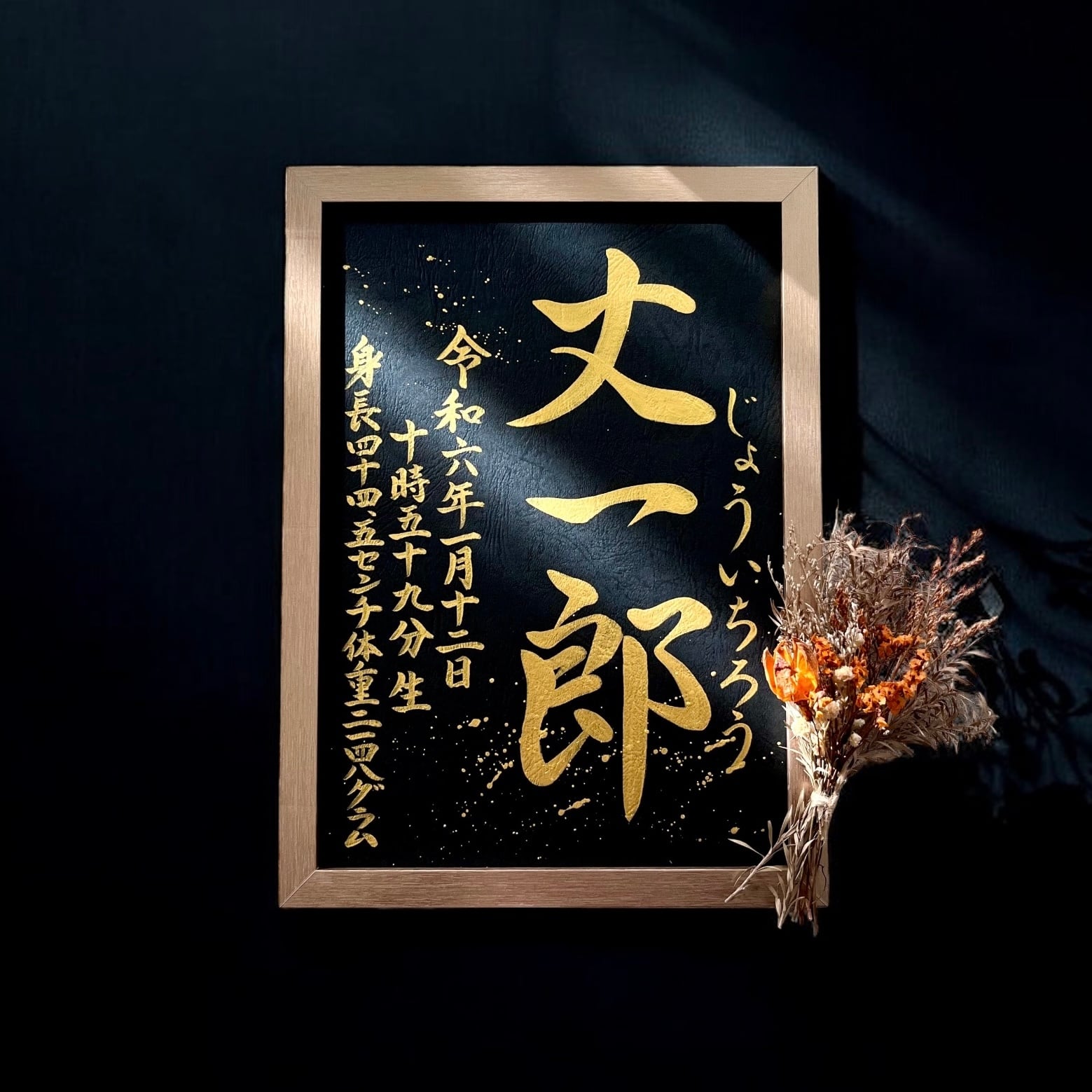 【Momoyama:桃山】シリーズは高級紙へ金墨にてお名前のイメージに合わせた書体で揮毫し、黒と金のコントラストが高級感と力強さの溢れるシリーズとなっております。